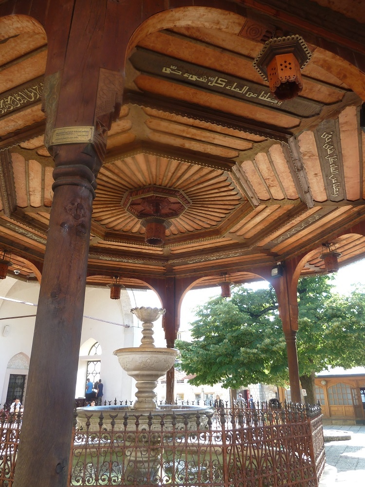 Si les pentes de Sarajevo sont hérissées de minarets, les mosquées les plus imposantes sont ici. Des croyants se lavent les pieds avec l’eau d’une fontaine, dans la cour ombragée de la mosquée Gazi Husrev Begova, histoire d’être propre pour aller prier. Une grande sensation de paix émane de l’endroit. Par respect nous n’allons pas plus loin. L’édifice date du XVIème siècle, il porte le nom de celui qui gouverna la région 17 ans durant sous le règne de Soliman le Magnifique, et qui lança la construction de ce qui est aujourd’hui cette vieille ville.
